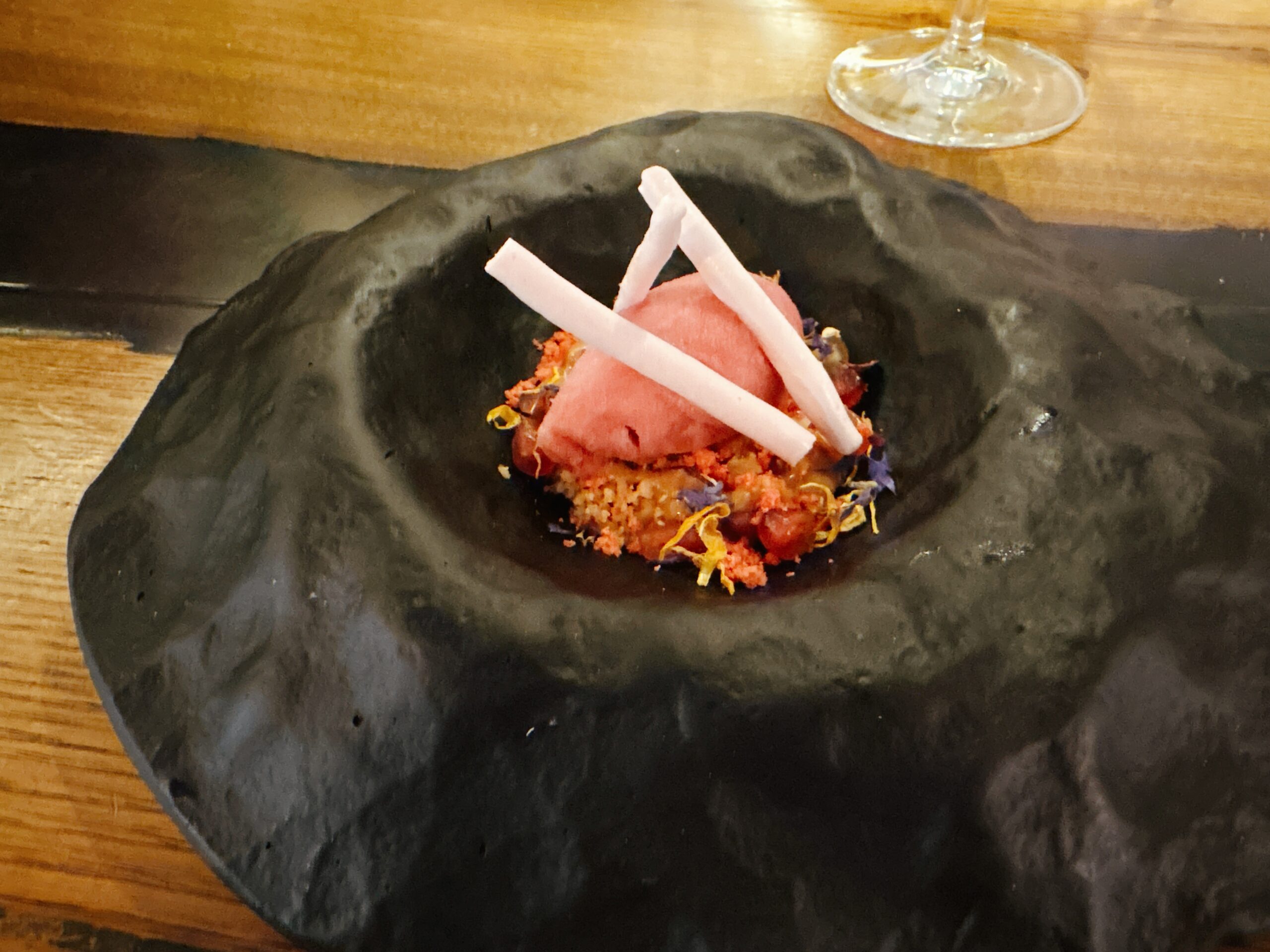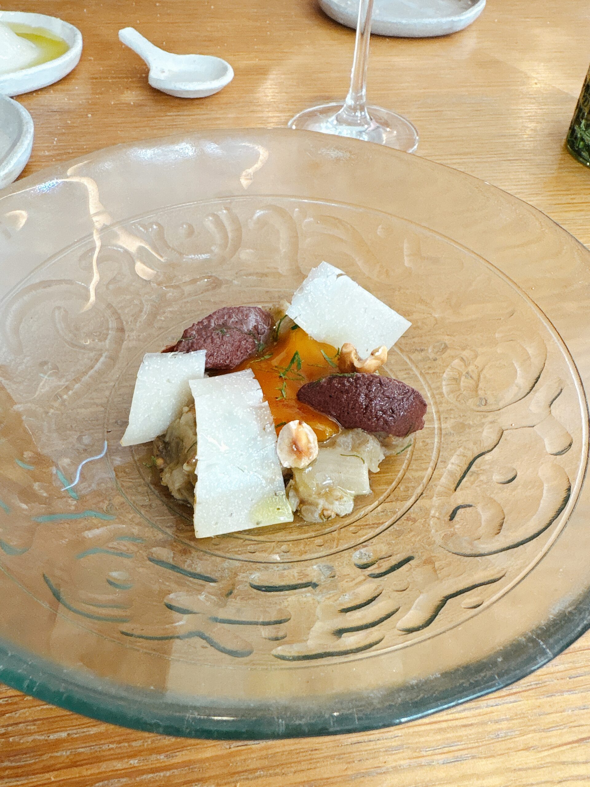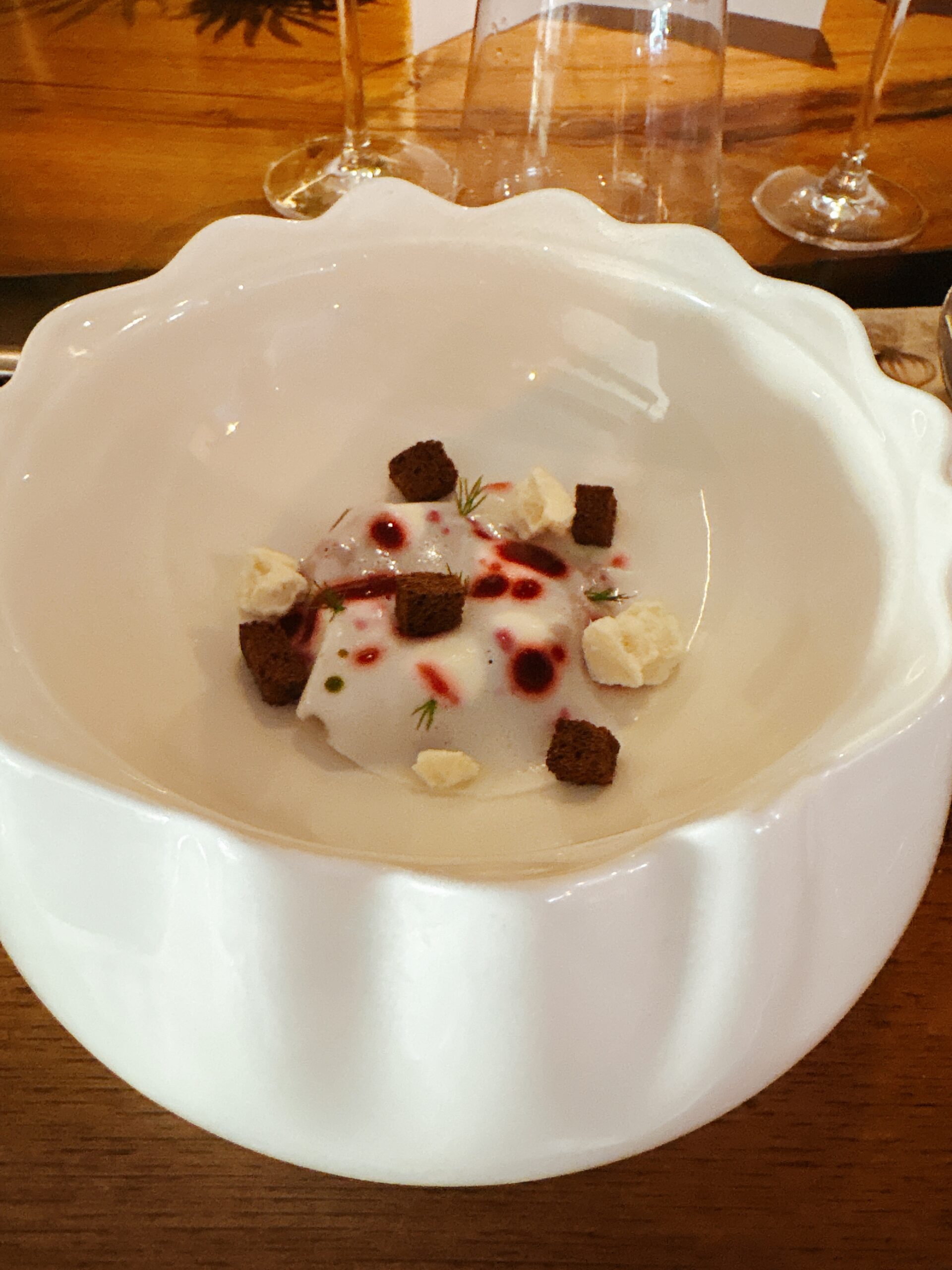 KONFERENZBIRNE IN SIRUP -mit weißer Schokoladen-Ganache und carquinyoli