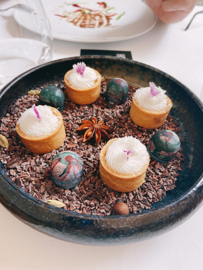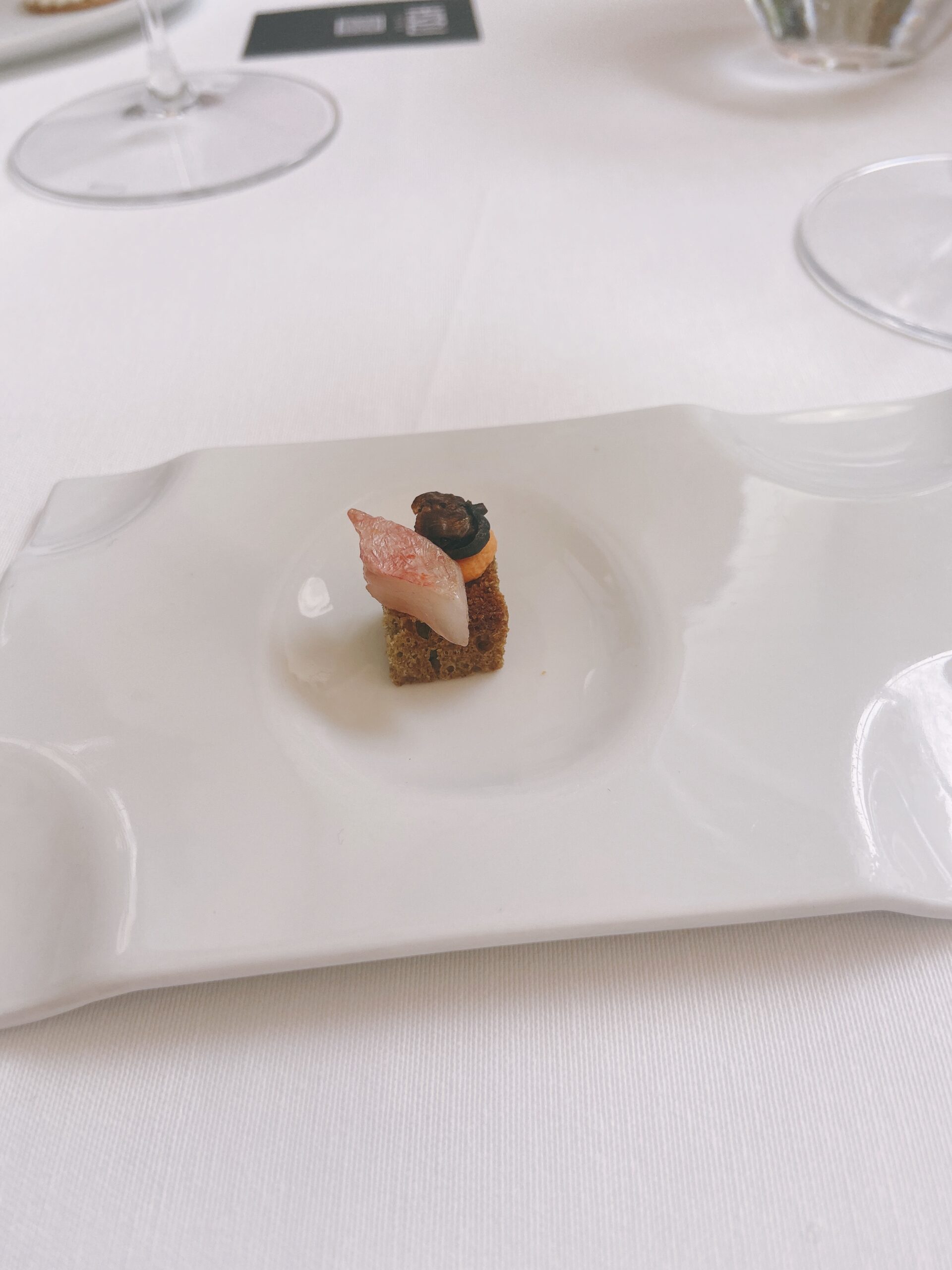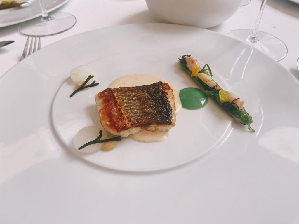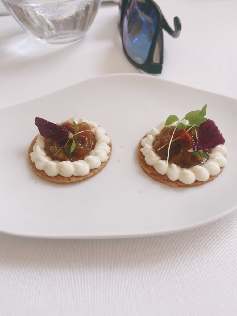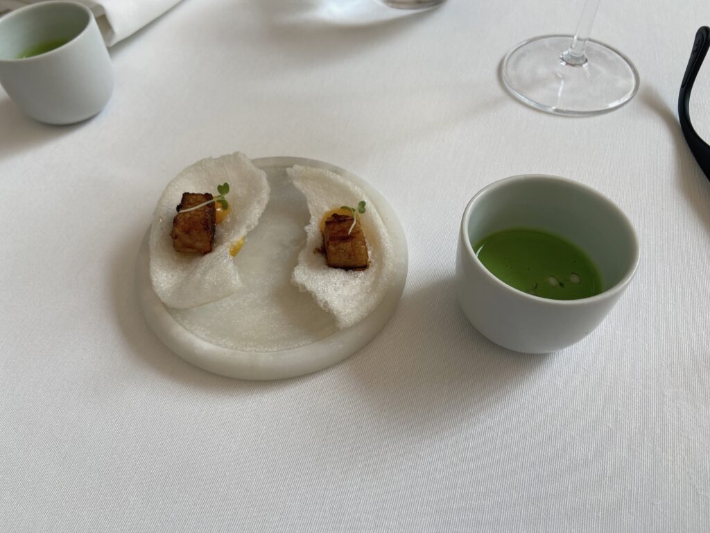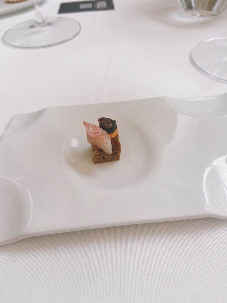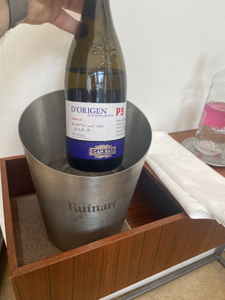 Garnelen-Kracker mit gegrilltem Pancetta und Mandarinen-Vinaigrette“Coca” mit karamellisierten Zwiebeln, Seeigel, Burrata und Orange See-Algen-Brioche mit Rotbarbe, Romesco-Emulsion und KapernMenü MarcD’Origen P3 Xarel.lo Can BasGeräuchertes Aal-Eis mit Roter Bete, Dill und gepresster Terrine vom iberischem SchweinRegionaler „Bombeta“ Reis mit Carabinero Garnelen, Waldpilzen und Liebstöck-ElemulsionWilder Wolfsbarsch, Meersalat Dashi, schwarzer Rettich, Miso, Schwertmuschel und Zitrusfrucht- VinaigretteLangsam gegrillte Taube über Holzkohle gegrillt mit geröstetem Zwiebelpüree, gefüllter Kohl und Tauben- Kakao-sauceRico Nuevo 2021 Bodega y ViñedosMallorquinische Erdbeeren „Savarin“ mit Hibiskus, Balsamico-Essig und geräuchertem Joghurt-EisZartbitterschokolade- und Olivenöl „Cremoso“ mit Paprika- und Himbeer-Sorbet und Basilikum-GeleePetit FourPetit Four