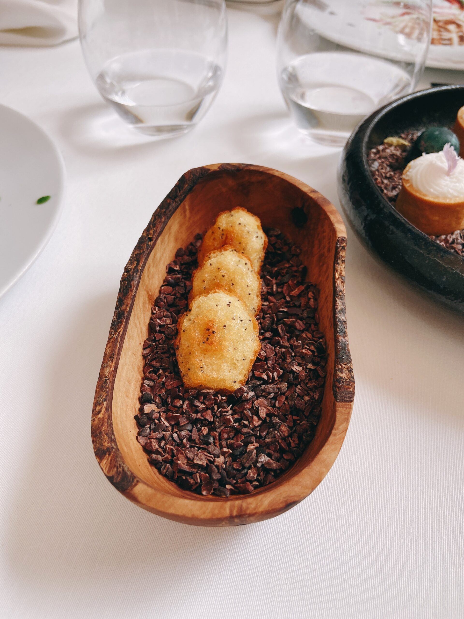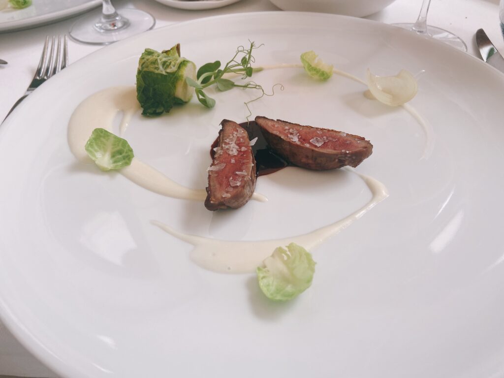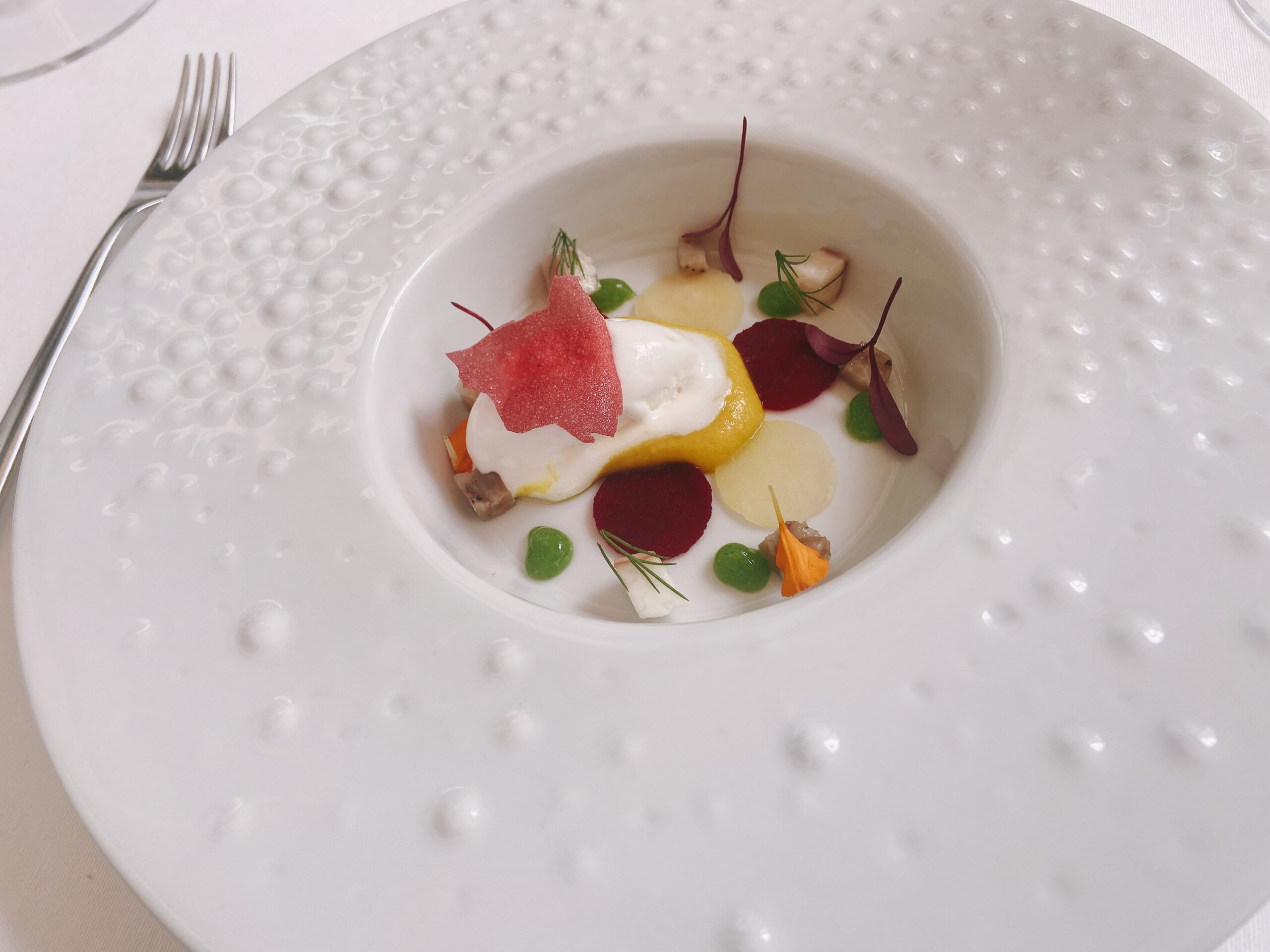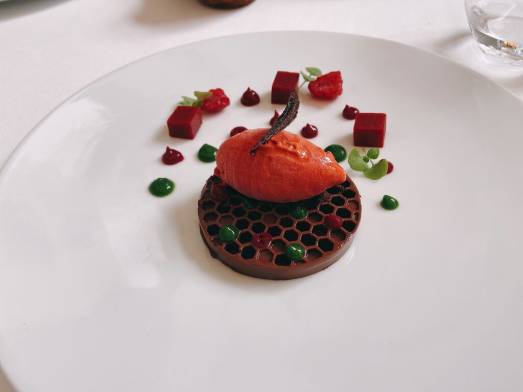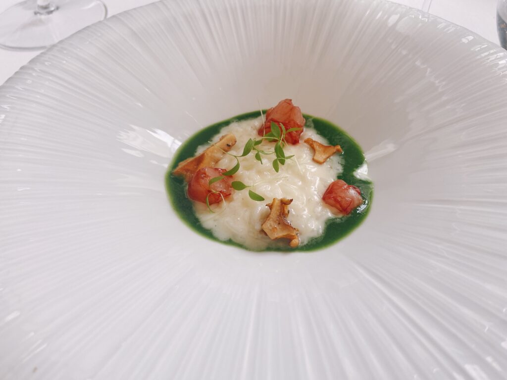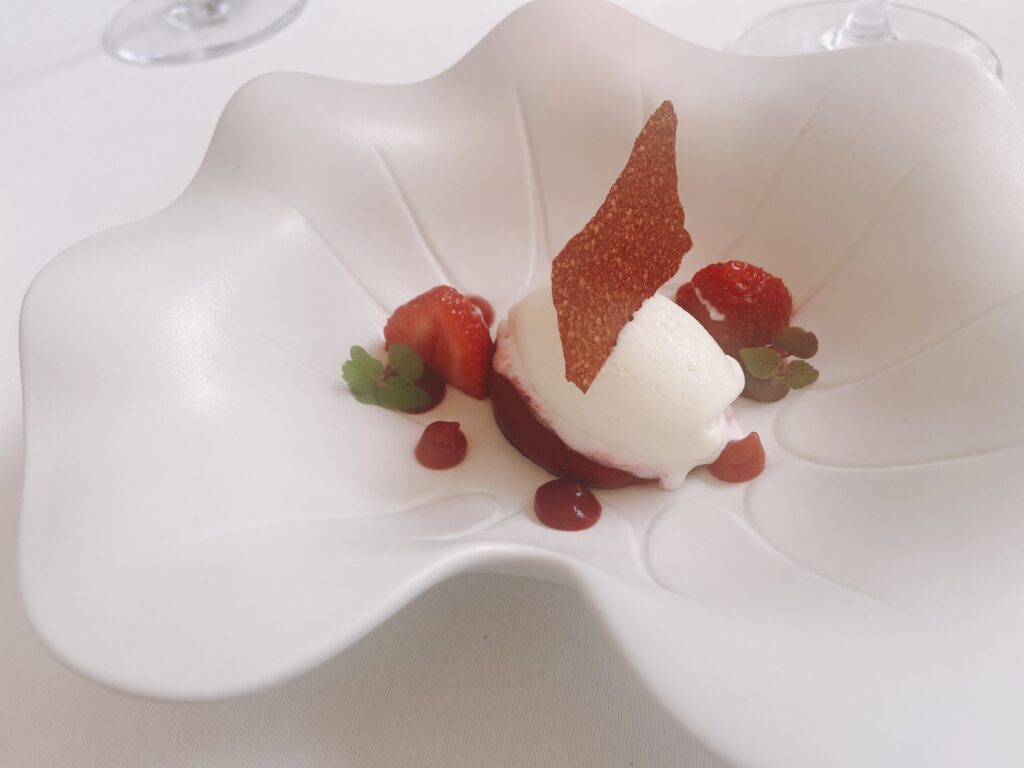Garnelen-Kracker mit gegrilltem Pancetta und Mandarinen-Vinaigrette“Coca” mit karamellisierten Zwiebeln, Seeigel, Burrata und Orange See-Algen-Brioche mit Rotbarbe, Romesco-Emulsion und KapernMenü MarcD’Origen P3 Xarel.lo Can BasGeräuchertes Aal-Eis mit Roter Bete, Dill und gepresster Terrine vom iberischem SchweinRegionaler „Bombeta“ Reis mit Carabinero Garnelen, Waldpilzen und Liebstöck-ElemulsionWilder Wolfsbarsch, Meersalat Dashi, schwarzer Rettich, Miso, Schwertmuschel und Zitrusfrucht- VinaigretteLangsam gegrillte Taube über Holzkohle gegrillt mit geröstetem Zwiebelpüree, gefüllter Kohl und Tauben- Kakao-sauceRico Nuevo 2021 Bodega y ViñedosMallorquinische Erdbeeren „Savarin“ mit Hibiskus, Balsamico-Essig und geräuchertem Joghurt-EisZartbitterschokolade- und Olivenöl „Cremoso“ mit Paprika- und Himbeer-Sorbet und Basilikum-GeleePetit FourPetit Four
