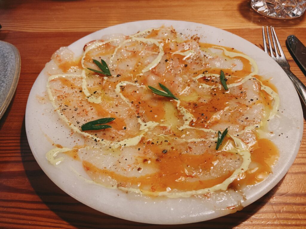 Garnelencarpaccio, Kopfemulsion, Seefenchel und Knoblauch