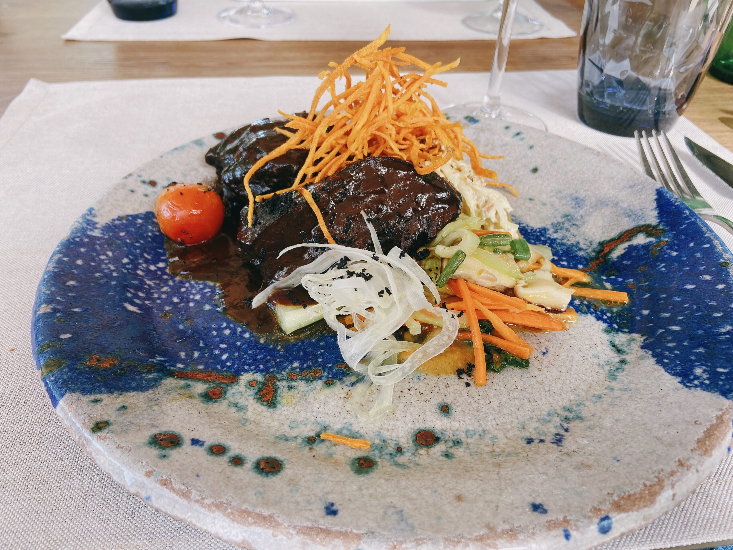 Geschmorte Rinderbacke mit süßem Malvasia und Trauben