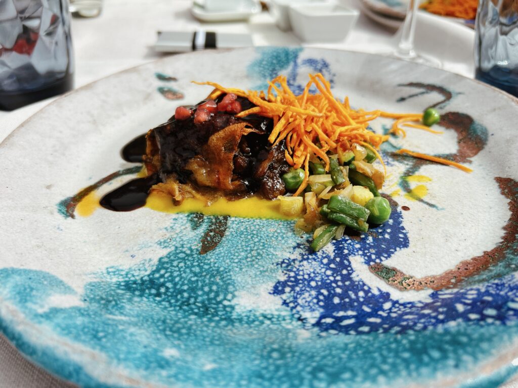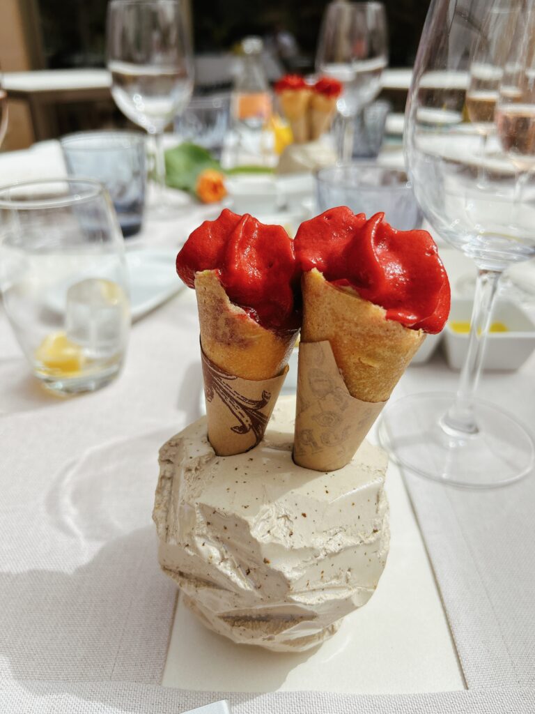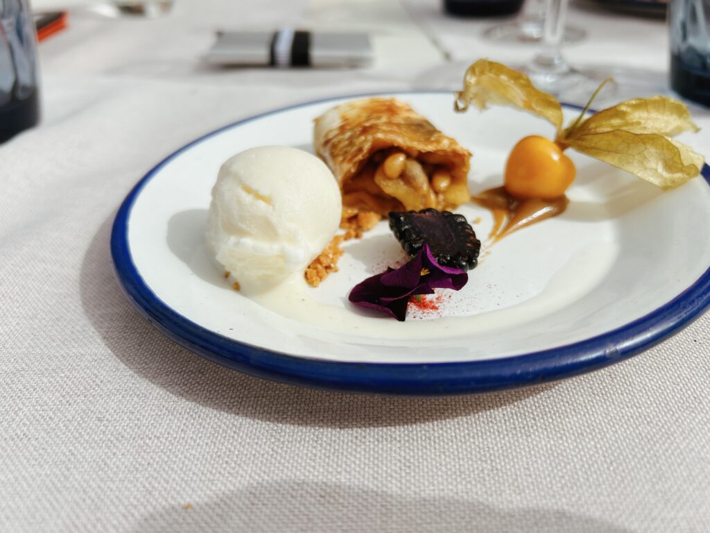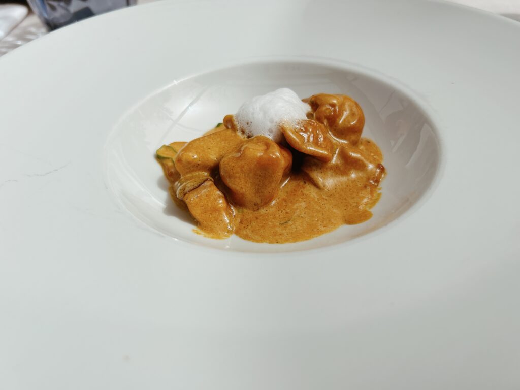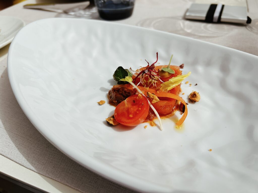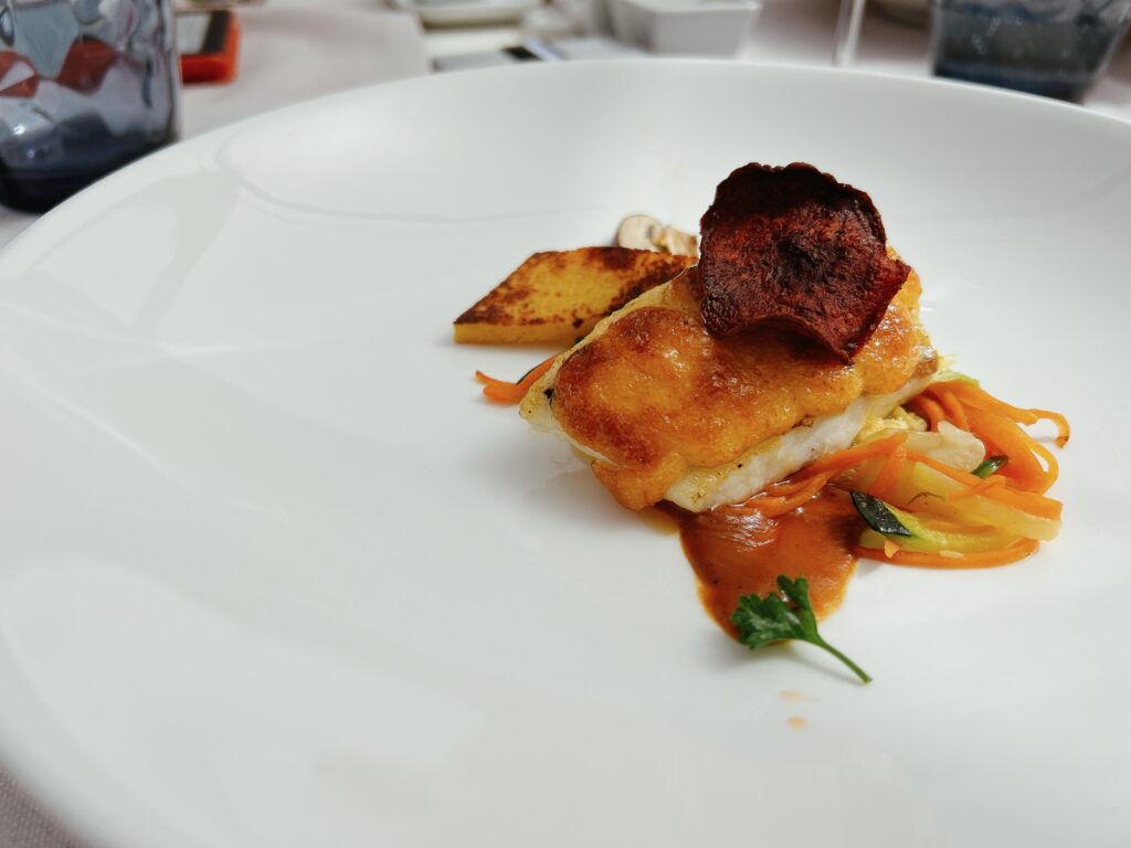 MenuFISCH CEVICHE HÖRNCHEN RÜBENSCHAUMKANDIERTER TOMATENSALAT MIT MISOSCHAUMTRÜFFELTÜTCHEN IN SHITAKE SOSSEGLASIERTER STEINBUTT MIT SASHIMITOGARASHI UND POLENTARINDERFILET MIT FOIE GRASS UND PEDRO XIMENEZ SOSSEAPPELSTRUDEL MIT BEISERMILCHEIS UND ZITRONENVERBENE