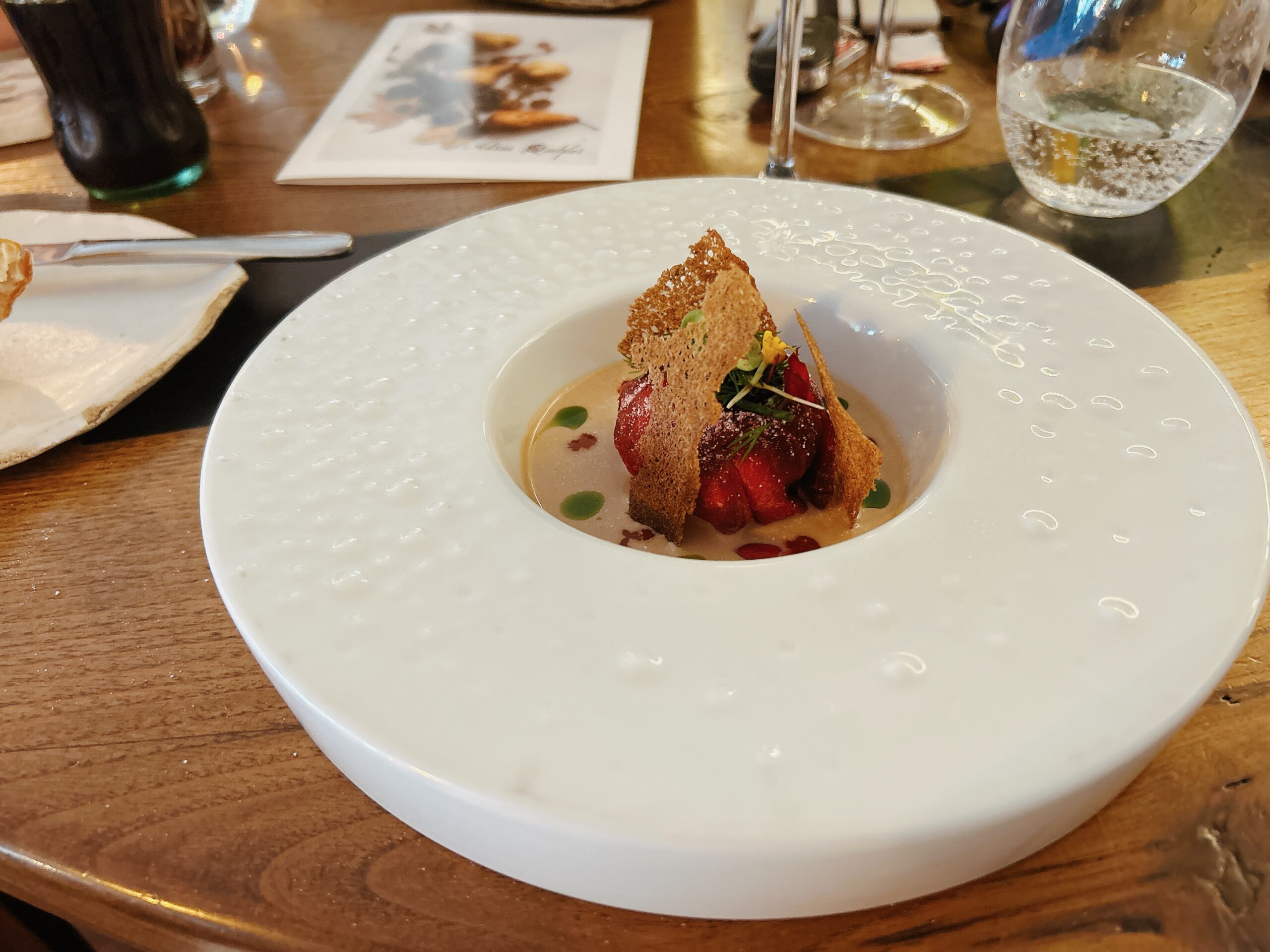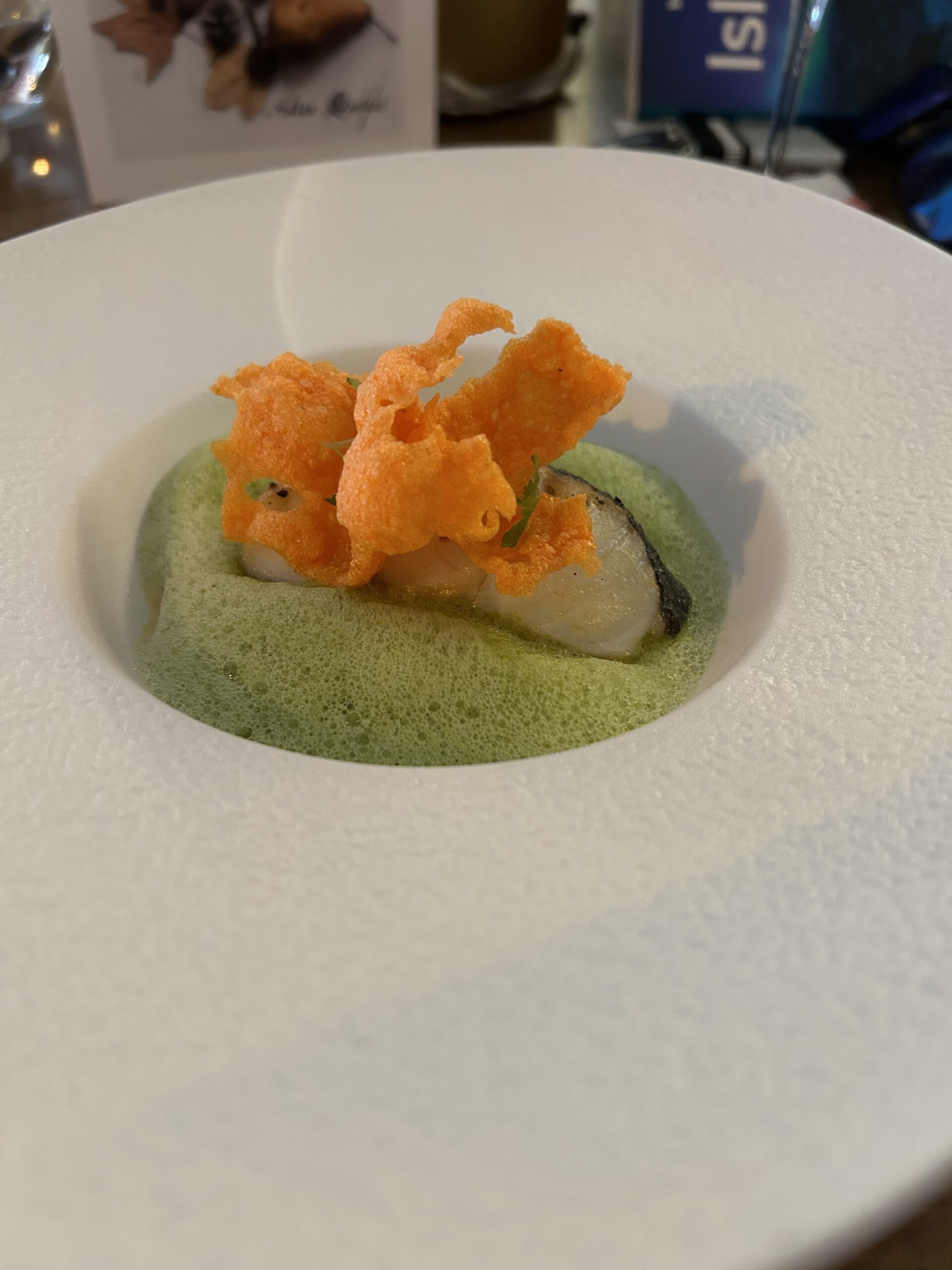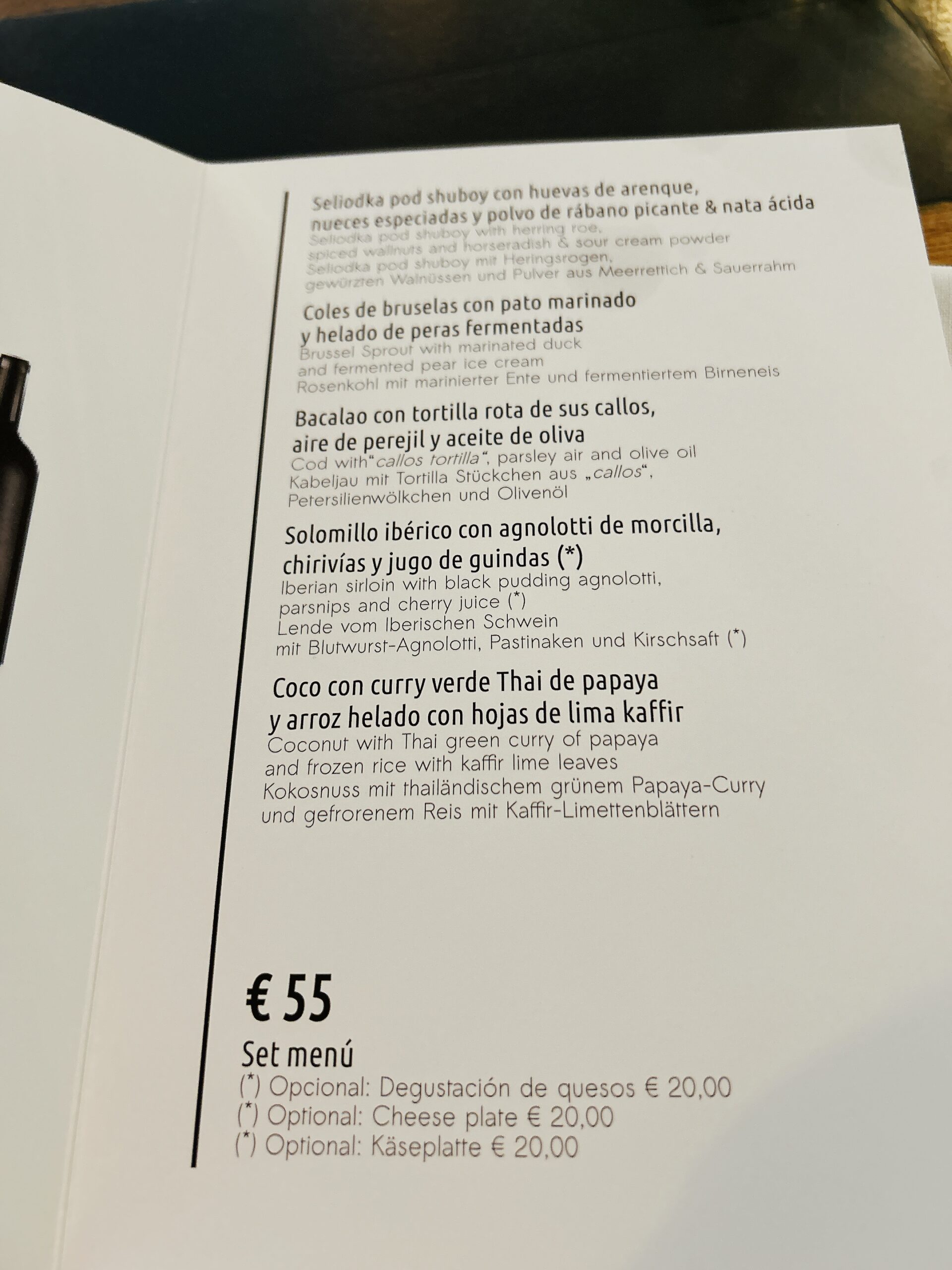 MenüMenüSeliodka pod shuboy mit Heringsrogen, gewürzten Walnüssen und Pulver aus Meerrettich & SauerrahmRosenkohl mit marinierter Ente und fermentiertem BirneneisKabeljau mit Tortilla Stückchen aus „callos“, Petersilienwölkchen und OlivenölLende vom Iberischen Schwein mit Blutwurst-Agnolotti, Pastinaken und KirschsaftKokosnuss mit thailändischem grünem Papaya-Curry und gefrorenem Reis mit Kefir-Limettenblättern