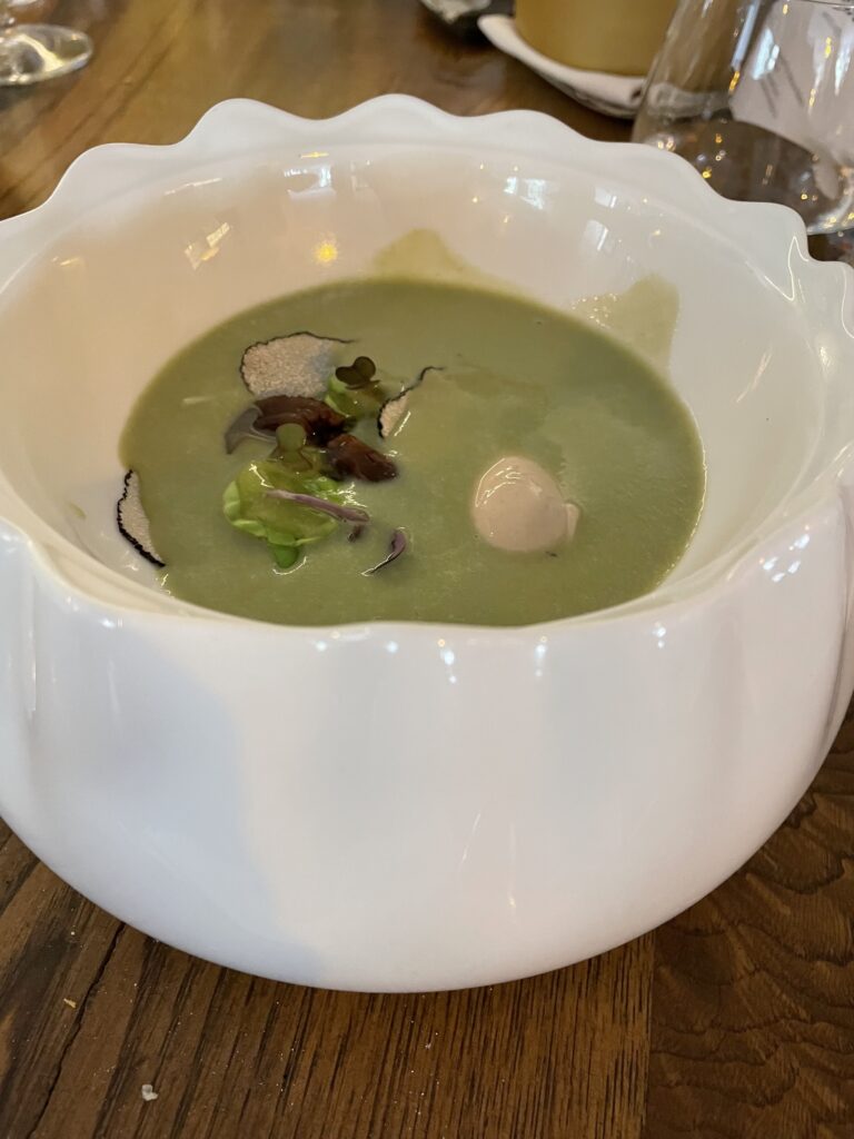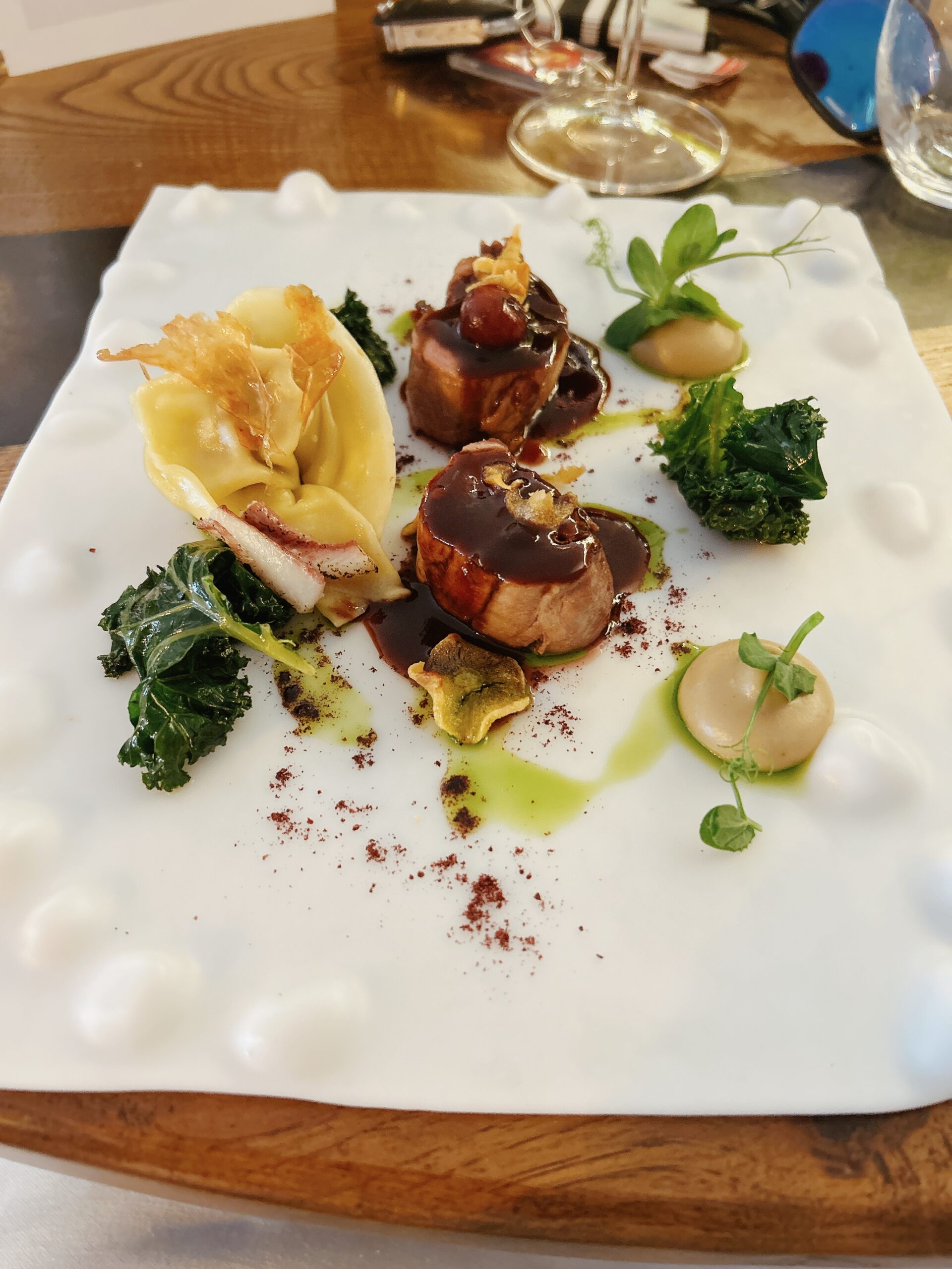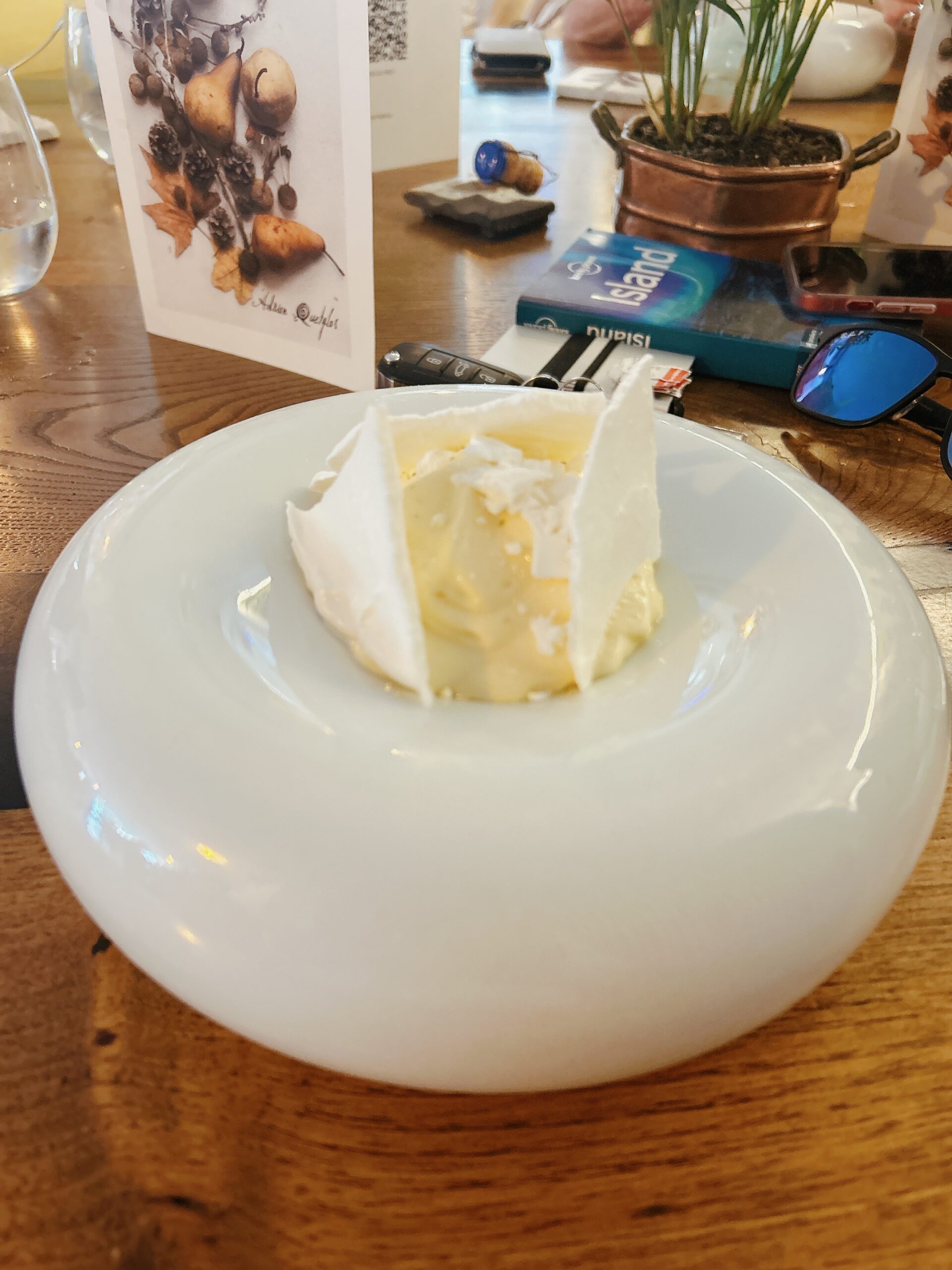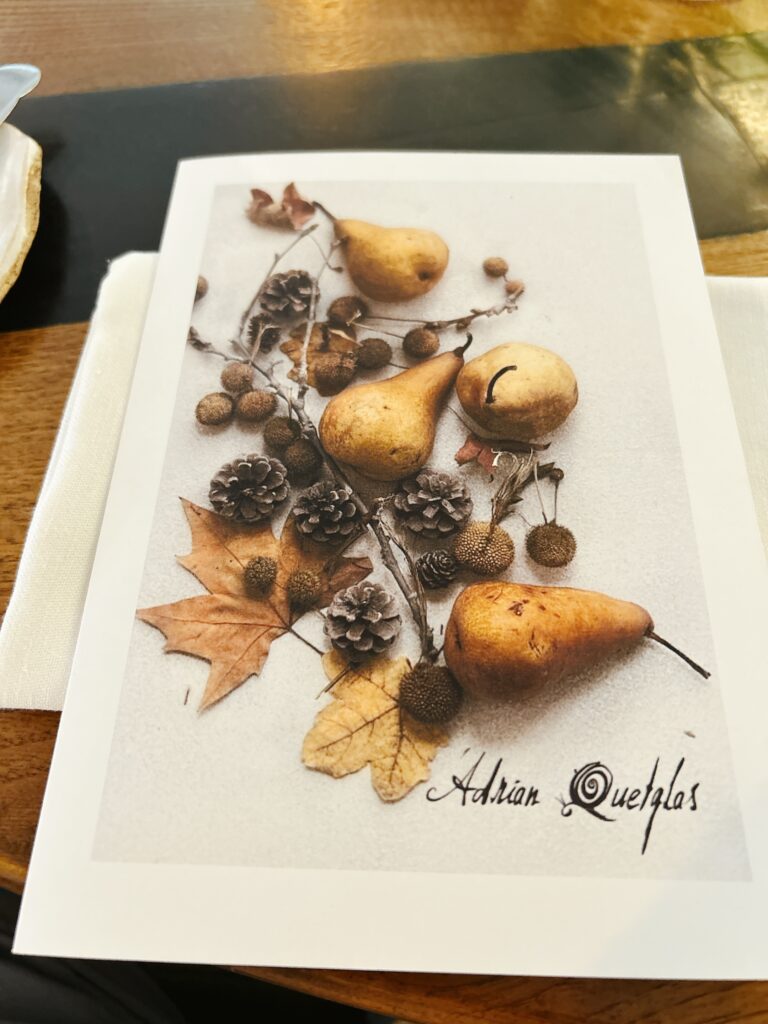 MenüMenüSeliodka pod shuboy mit Heringsrogen, gewürzten Walnüssen und Pulver aus Meerrettich & SauerrahmRosenkohl mit marinierter Ente und fermentiertem BirneneisKabeljau mit Tortilla Stückchen aus „callos“, Petersilienwölkchen und OlivenölLende vom Iberischen Schwein mit Blutwurst-Agnolotti, Pastinaken und KirschsaftKokosnuss mit thailändischem grünem Papaya-Curry und gefrorenem Reis mit Kefir-Limettenblättern